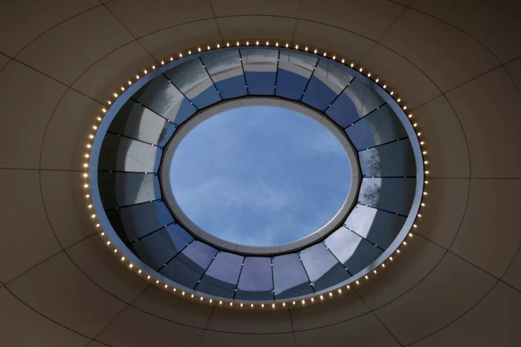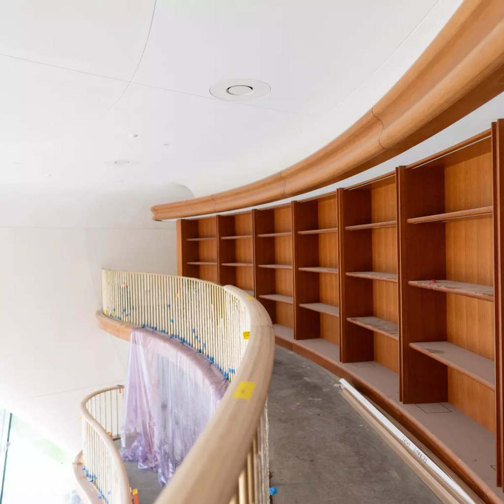 The library has three levels, two of which feature balconies with curved wooden railings that overlook the room, a lobby area, a bank of three elevators, and a hole in the ceiling of an exhibit hall called an Oculus. The walls are lined with honey-colored wood, and the vast expanse of the museum’s green, 11-acre park — with rolling hills dotted with native plants and newly planted trees.” Gelt said.