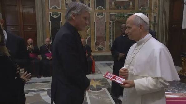 Actor Viggo Mortensen greeted Pope Leo XIV after the meeting with the World of Cinema in November of 2025. Image courtesy of Romereports.com