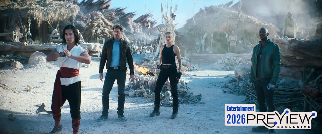 Ludi Lin as Liu Kang, Karl Urban as Johnny Cage, Jessica McNamee as Sonya Blade, and Mehcad Brooks as Jax in “Mortal Kombat II”. Credit: Warner Bros. Pictures